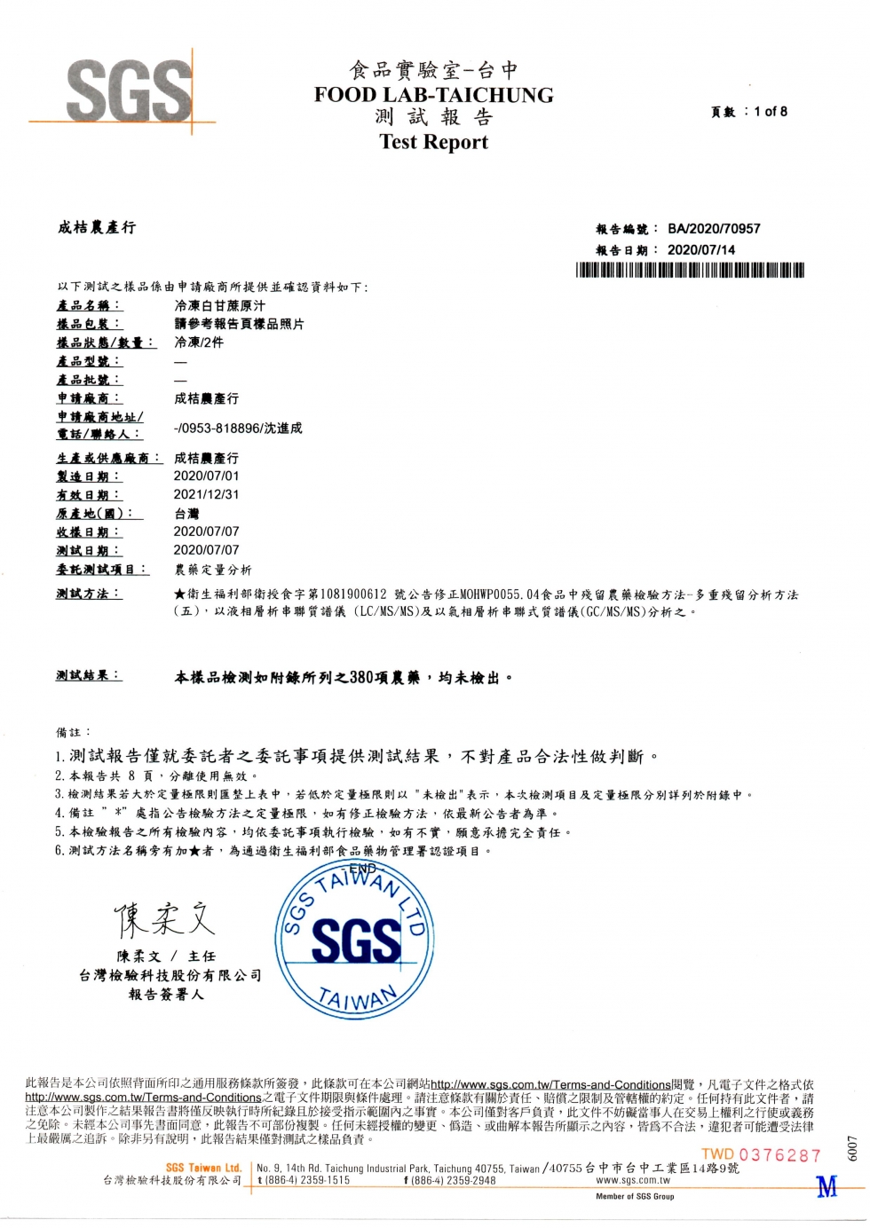 SGS 檢驗報告 2020年7月